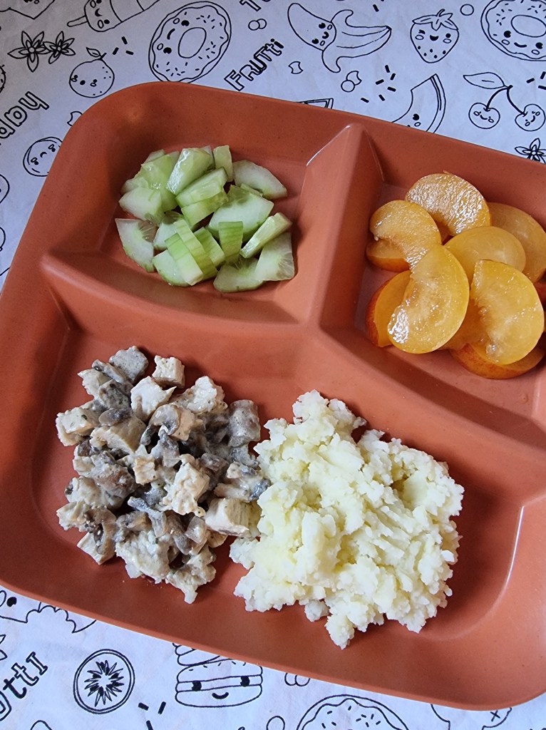 - Escalope de dinde à la crème et aux champignons, purée de pommes de terre