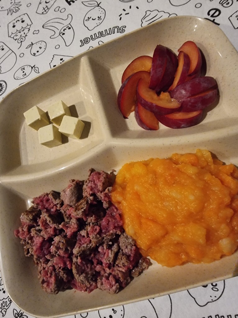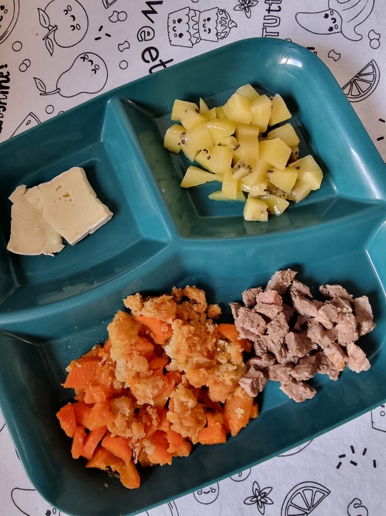 - Steak haché (cuisson enfant de 4 ans habitué), purée de patates douce / carottes / pommes de terre