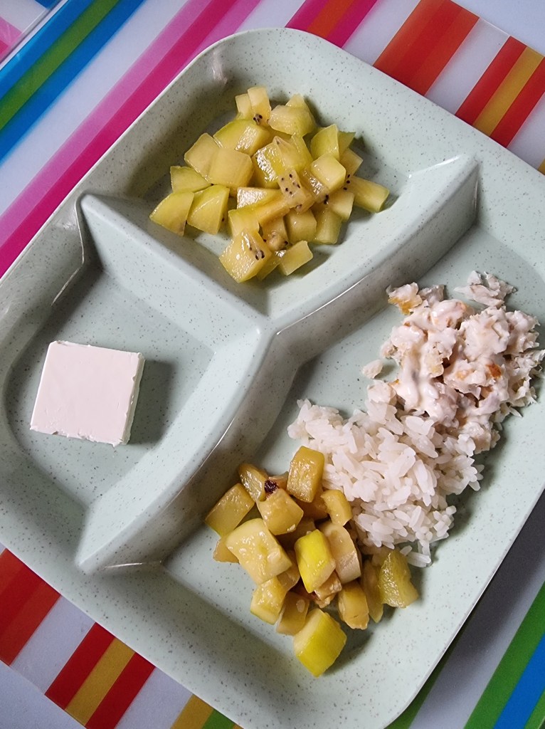 Les fruits pour bébé sont proposés pour le moment écrasés ou en compote. J’introduis au plat le fromage ou je le propose à côté selon la texture.