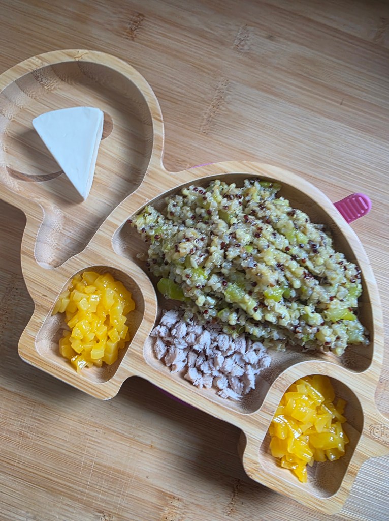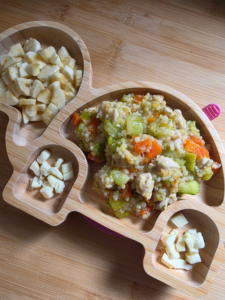 - Poulet, perles de blé/courgettes/carottes