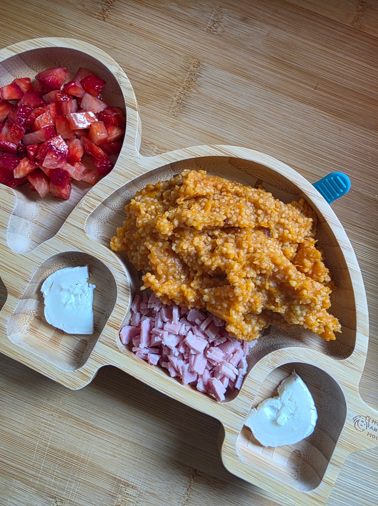 - Jambon, patates douces/lentilles corail/tomates/semoule